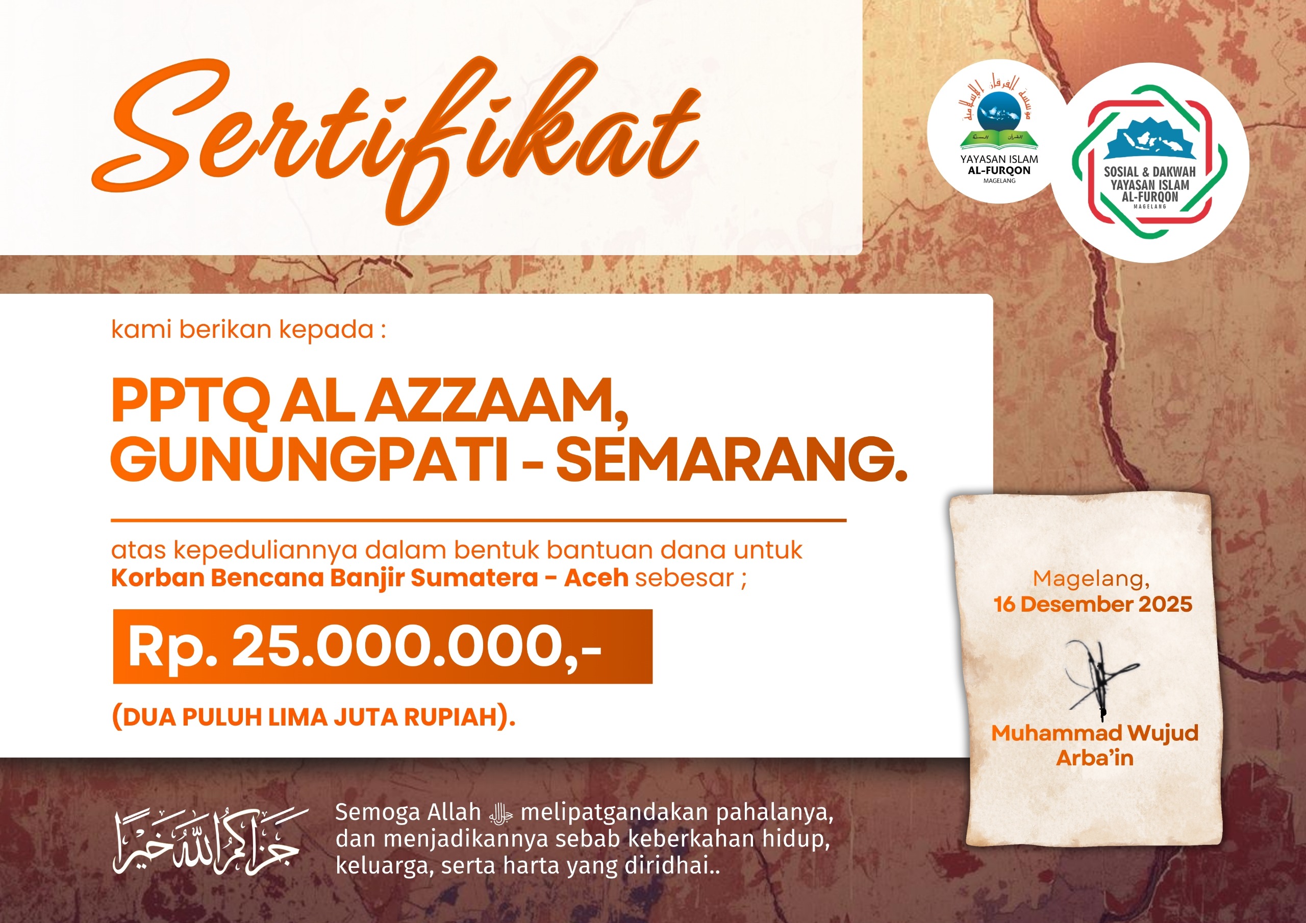 Alhamdulillah, PPTQ Al Azzaam Gunungpati - Semarang telah menyalurkan bantuan dana untuk korban bencana banjir Sumatera - Aceh melalui Ust. Muhammad Wujud Arba'in di Magelang pada tanggal 16 Desember 2025.